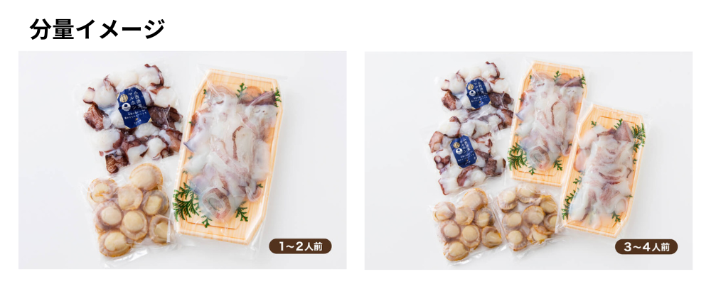 1つの魚種が「1〜2人前」と「3〜4人前」ずつ入った、2つの分量からお選びいただけます。
