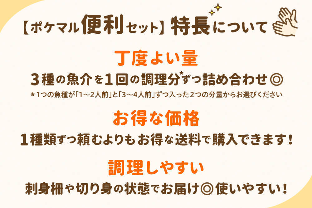 そこで、ポケマルの美味しい魚介をもっと手軽に召し上がっていただけるよう、3種の魚介を1回の調理分ずつ詰め合わせた【🐟ポケマル便利セット📦】を作ってみました!