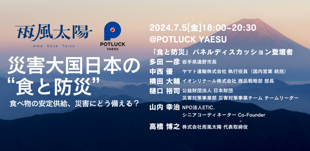 災害は私達の日常にある”食”の安定供給を脅かします。そこでこの度、発災時の備えとして、日頃私達に何ができるのかを考えるべく、“地域経済創発プロジェクト”「POTLUCK YAESU」と当社の共催で、7/5(金)「食と防災」を考えるイベントを開催する運びとなりました🎤