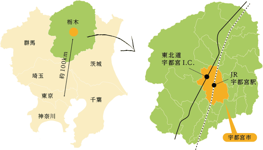 宇都宮市は、栃木県のほぼ中央、東京から北に約100kmの距離に位置する北関東の中枢拠点です。