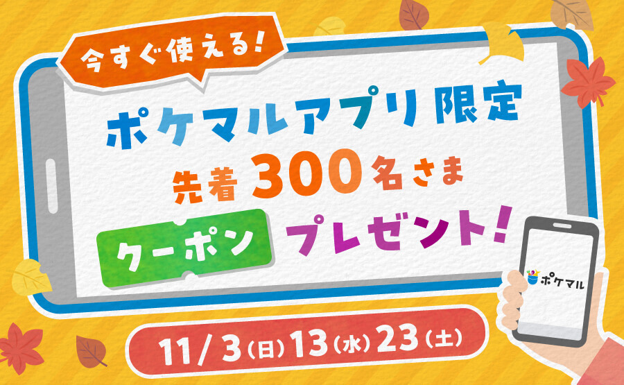 ・クーポン発行のお知らせは、メール(ポケマルからの通知をOKしている方のみ)と、ポケマル公式アプリのマイページへのメッセージ通知でお届けします。>アプリのダウンロードはこちら