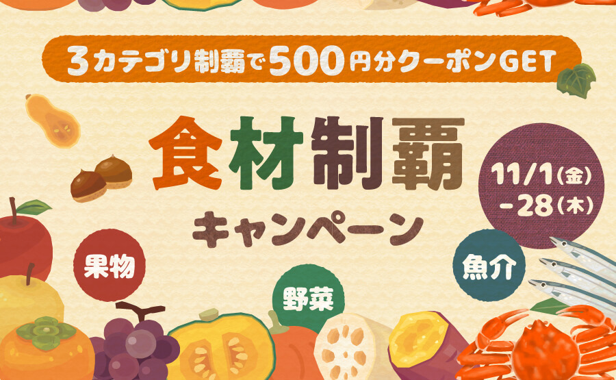 人気企画が登場!11月も、お得な「“食材制覇”キャンペーン」を実施します🎉指定する3つのカテゴリーの食材(単品)を購入いただいた方にもれなくクーポンをプレゼント🎁