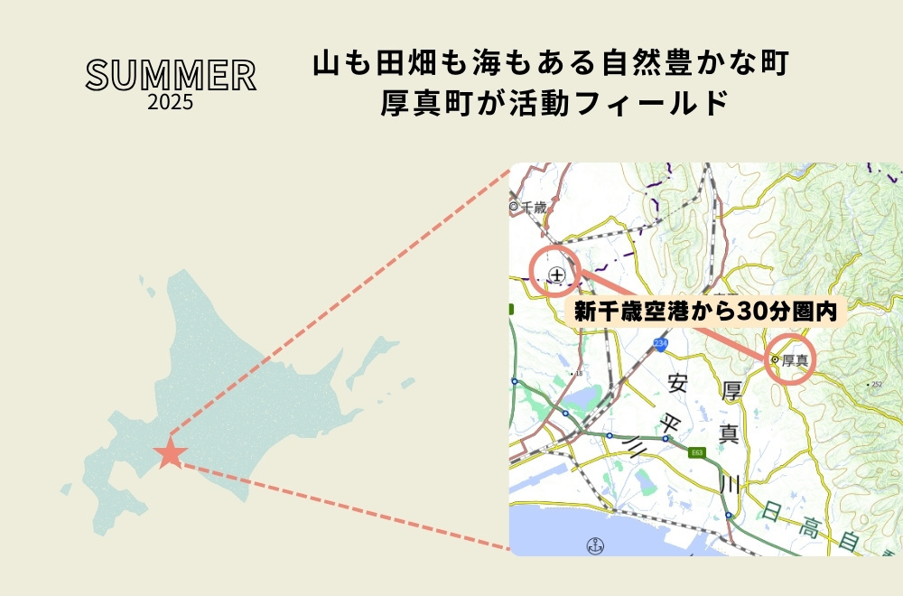 北海道勇払郡厚真町(あつまちょう)は、北海道の南西部に位置し、南北に細長く、太平洋に面した地域。車で新千歳空港から約35分、札幌市から約90分。サーフスポットとしても著名な浜厚真海浜公園をはじめ、日本全国からサーファーが集うサーフィンの盛んな地域でもあります。8月の平均気温は25℃前後。北海道らしい大自然は海と山それぞれの特色を持つのが厚真町です。