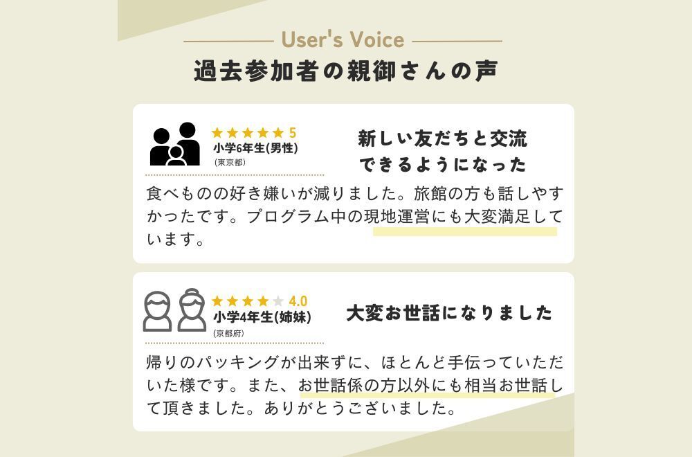 ・子どもも高学年になり、親と離れた生活体験を検討している方