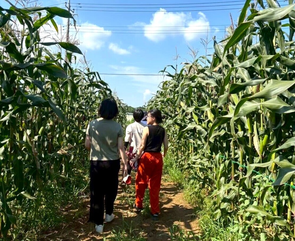 到着すると、ご夫婦で笑顔で迎えてくれて、作業場の涼しい部屋で飲み物・スイカ・プラチナコーンをいただきました。私たちのために冷やして待っていてくれて、まるでおじいちゃんの家に来たかのような温かさでした。
