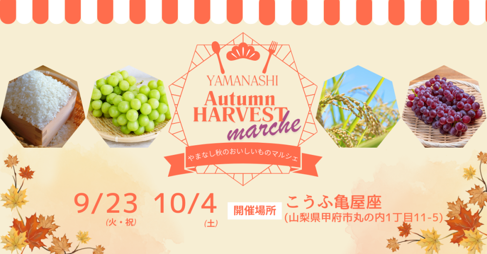 甲府市の『こうふ亀屋座』にて、甲府市や南アルプス市などを含む「県央ネットやまなしエリア」の美味しい秋の味覚を楽しむマルシェを開催します!甲府に少し足を運ぶだけで、山梨県の美味しい秋の味覚を味わうチャンスです😊