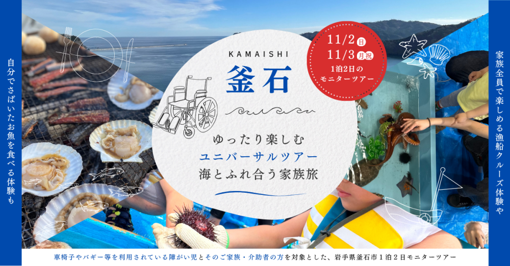 そんな根浜海岸で、海の恵みと漁業の魅力を体験する、車椅子やバギー等の方を対象としたユニバーサルモニターツアーを開催します!あまり海にふれたことがない車椅子やバギー等の方にも、ゆったりと海のクルーズ体験や魚さばき体験などをお楽しみいただける機会です✨