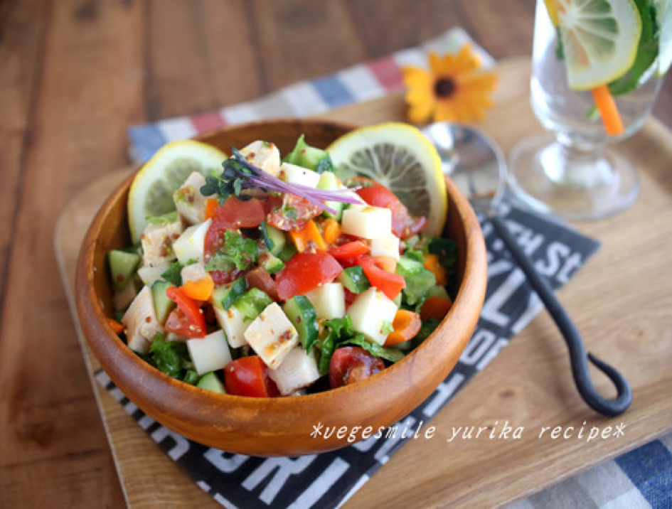 チョップドサラダとは、具材を小さくカットしたサラダのこと。スプーンですくっていただけるので、食べやすいです。また、お野菜にドレッシングがよく絡みます。