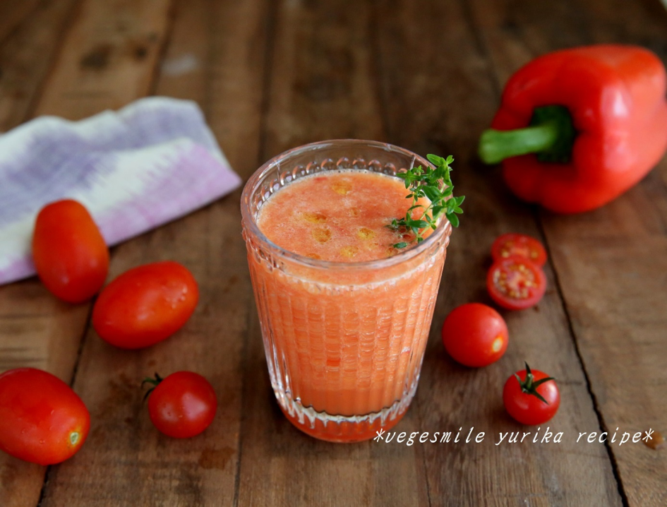 トマトのリコピン、パプリカ、オレンジは、美肌に良いビタミンCもたっぷりのアンチエイジングスムージー。さらにオイルを少量加えるとリコピンの吸収率が上がります。