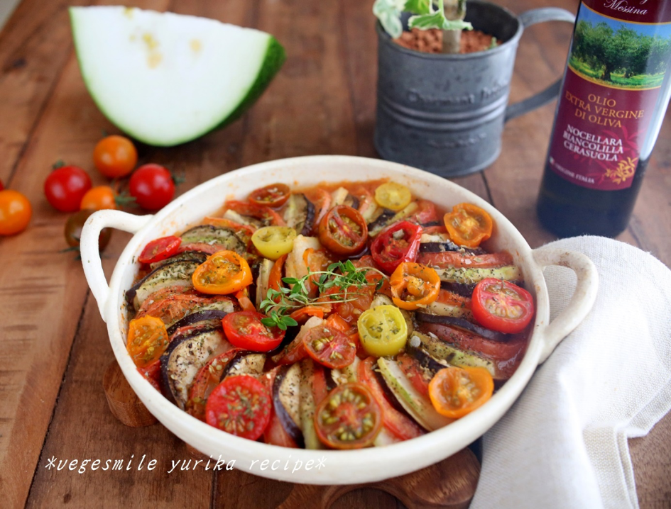 1 耐熱皿にトマトソースを敷き、薄く切ったトマト、ナス、ズッキーニなどの野菜類を交互に重ねて並べる。
