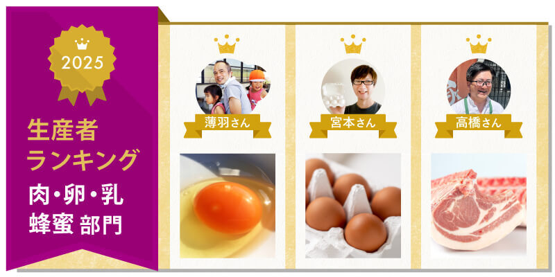 今年も美味しい出会いやあたたかい交流を通じて、記憶に残る体験を届けてくださった生産者の皆さん。日々、美味しいものを届けたいと、ユーザーさんと向き合い続けるその皆さんへ感謝と敬意をこめて、今年も生産者ランキングを発表させていただきます❗今回はポケマル史上初の殿堂入り生産者さんも誕生です✨それではランキングを発表します❗ポケマル初✨殿堂入り&総合部門から…※ランキングは販売数とごちそうさま投稿率、評価点を指標に算出しています(殿堂入りの生産者さんはランキング対象外)ーーー✨総合ランキング殿堂入り✨ーーー 👑二宮昌基さん🎉この度はポケットマルシェ初の殿堂入りという名誉を賜り、ありがとうございます。これもひとえにご購入してくださった皆様のおかげだと思っております。今後もさらにお客様のご要望にお応えできるように頑張っていきますのでよろしくお願い申し上げます。また、今回の殿堂入りを記念して各種お得な商品を年末年始用にご用意いたしておりますのであわせてよろしくお願い申し上げます。二宮昌基さんのページはこちら!ーーーー✨総合ランキング✨ーーーー🥇第1位 薄羽哲哉さん🎉ベテランのパートさんパワーも借りて家族総出で鶏・卵を育てています。小さな子供も安心して食べることができ、買った人も、もらった人も喜んでいただける美味しい卵を作りたい、そんな想いで今日も農場をバタバタと走っています。プロフィールページのポケマルでの軌跡もチェック!薄羽哲哉さんのページはこちら!🥈第2位 吉田匡宏さん🎉青森県の大自然の中で、にんにくとりんごを栽培している農家です。土づくりにこだわり、栽培方法にこだわり、安全性にこだわり、どんなに収益性が悪くても、どんなに経費がかかっても、心から自信を持ってお届けできるものを、正直につくっております。皆様からの「美味しい!」「ごちそうさま!」の一言で、私たちは今日も頑張れます。吉田匡宏さんのページはこちら!🥉第3位 菅野千秋さん🎉「やっぱり我が家のりんごはうまい!」と“江刺リンゴ”の魅力にひかれ就農しました。私たちの作っているものは、色艶の“美しさ”、芳醇な“香り”、溢れ出る果汁&シャキッと食感“新鮮”、甘酸バランスのとれた濃い味“コク”が特徴です。お客様の心に感動を与えるリンゴを作っています。菅野千秋さんのページはこちら!第4位 山本康平さん🎉果物に満ち溢れ、果樹の並ぶ農園の景色は私の誇りで、木々の命を引き継ぎたいという気持ちから農家となりました。和歌山市の山東地域で果樹を栽培して、皆さんに美味しい!こんなの食べたことない!と”感動”をお届けできるように日々頑張っています。山本康平さんのページはこちら!第5位 藪内晃幸さん🎉みかんで感動を!!をモットーに美味しいみかんを届けれるよう日々栽培しています。サラリーマンをしていた時、叔父の栽培している有田みかんを食べて感動しました。こんなみかんを自分でも栽培したいと強く思うようになり、就農を決意し和歌山へ移住しました。量より質を優先しており、みかんの栽培に一切の妥協はいたしません。みかんで感動していただけるように全力で栽培しています。藪内晃幸さんのページはこちら!第6位 竹下誠一さん🎉日々やさいの気持ちを感じています。「人に、自然にやさしい、野菜への思いやり、高原の清涼な風や空気や水までお客様の元へ届けたい。」 それが私たちの思いです。竹下誠一さんのページはこちら!第7位 植田大さん🎉静岡のお茶処、牧之原でお茶の栽培・製茶・包装の一貫製造をしています!お茶の完成像を考えたお茶栽培と製茶技術を更に磨いていくため、毎日お茶と触れ合っています。全国の皆さんにもっともっとお茶の事を知ってもらい、気軽に楽しんで頂けるように努めていきたいと思っています!どの商品もお茶農家・茶師として品質に対する誇りを持ち、仕上げさせていただいております。植田 大さんのページはこちら!第8位 中島康範さん🎉野菜作りでいちばんこだわっているのは、根幹となる『土』です。排水性向上のためヤシの木くずをブレンド、酵素栽培&減農薬etc...食べていただくあなたに『おいしいっ!』と感じていただくことを目標に、安心安全な野菜をお届けします。中島康範さんのページはこちら!第9位 宮本大史さん🎉右も左も分からずに始めた3代目、気が付いたら千葉県なのに名古屋コーチンを飼育、さらに白鶏・赤鶏・アローカナ鶏も始めて収拾付かない小規模経営をしています!鶏にこだわり、エサにこだわり、鮮度にこだわって、消費者の皆様に「おいしい!」と言っていただけるタマゴを日々生産できるよう奮闘しています!宮本大史さんのページはこちら!第10位 数見隆一郎さん🎉由良町の美しい景観を残したい!故郷の農地を守る為に就農を決意しました。七代目農家として他の農家に研修に行きながら、仕事を習得。地元の幼馴染と共に同じ仕事ができるのは最高の励みに