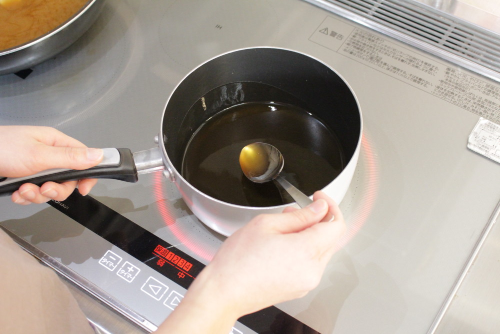 3. 小鍋にめんつゆ、水、片栗粉を入れ、よく混ぜてから火にかける。沸騰してとろみがついてきたら、混ぜながらさらに1分ほど加熱する。