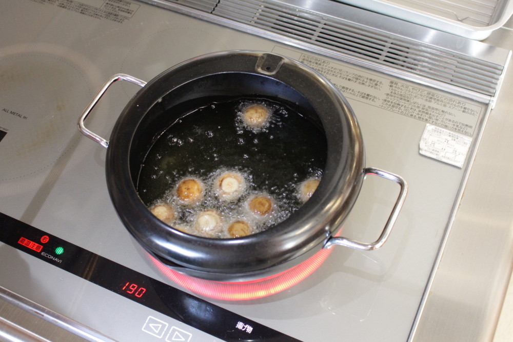 5. 190℃に熱した揚げ油で数分、衣がからっとするまで揚げる。