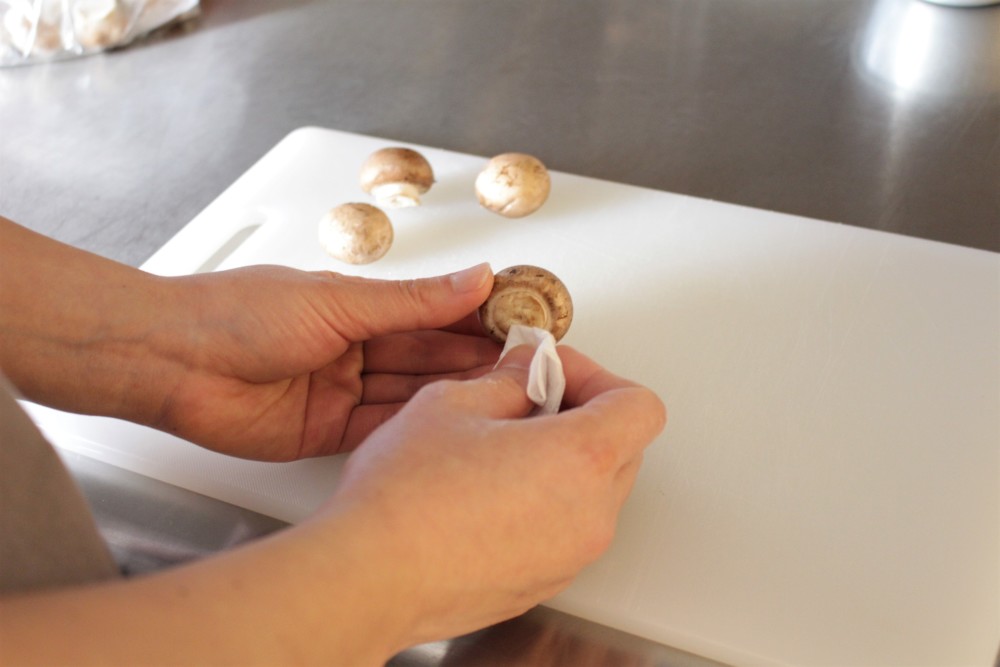 1. マッシュルームは汚れがあれば、軽く塗らしたキッチンペーパーで拭いておく。
