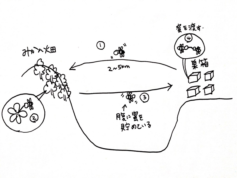 飛んでいった蜂が、ストローみたいなもので蜜を吸い身体の中に入れるんですね。そのまま飛んで戻ってきて、巣の中にいる保管係の蜂に口移ししているみたいな感じです。