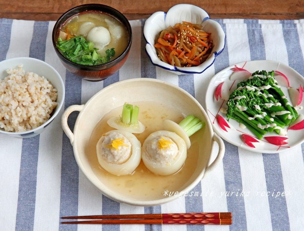 一品目は、可愛らしい「小かぶ」を使ったお料理をご紹介致します。煮るととろーりやわらかな食感が美味しいかぶ。この小かぶの中身をくり抜き、鶏ひき肉のタネを詰めて煮込みました。やさしい生姜あんをからめると、かぶの甘味もしっかり味わえます。