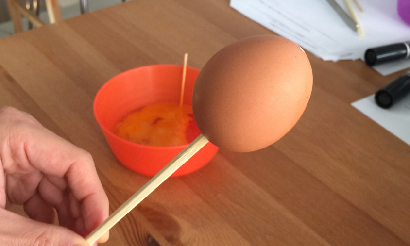 ボウルの上でタマゴを縦に持ち、小さい穴の方から空気を吹き込むと、下側から卵の中身が出てきます。中身がすべて出たら、殻を壊さないようにやさしく流水で洗ってください。