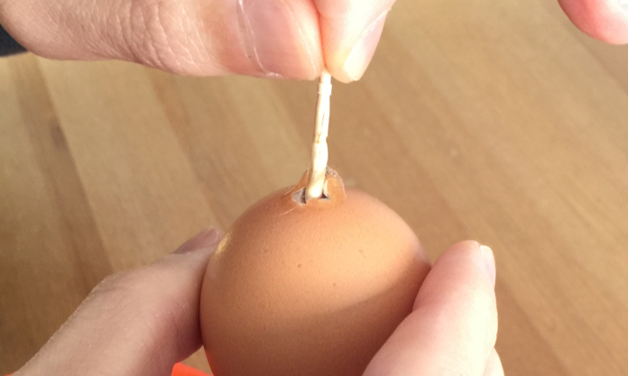 大きめに開けた方の穴からつまようじをいれて、卵の中身が出やすいように軽くかき混ぜて黄身を割ります。
