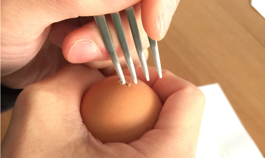 フォークを斜めにあててやさしくグリグリすると、卵の殻が削れるように穴があいていきます。片方の穴は直径2〜3mmくらい、もう片方の穴は割り箸の先がギリギリ通るくらいの大きさに広げます。
