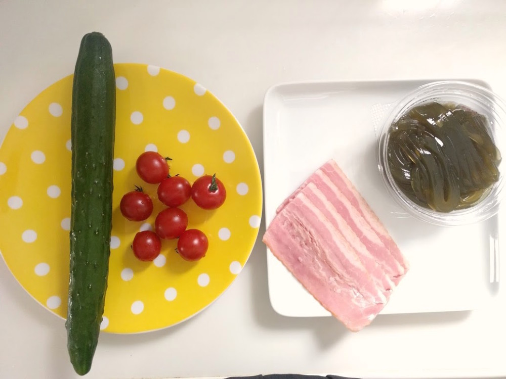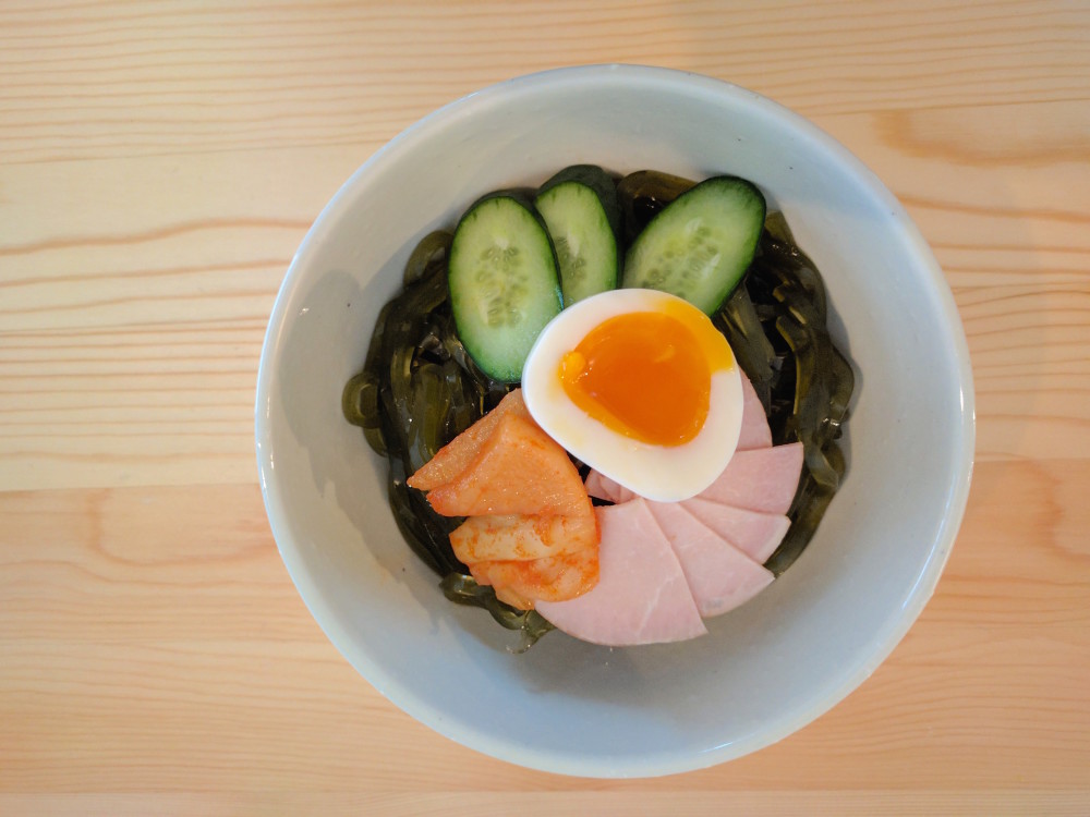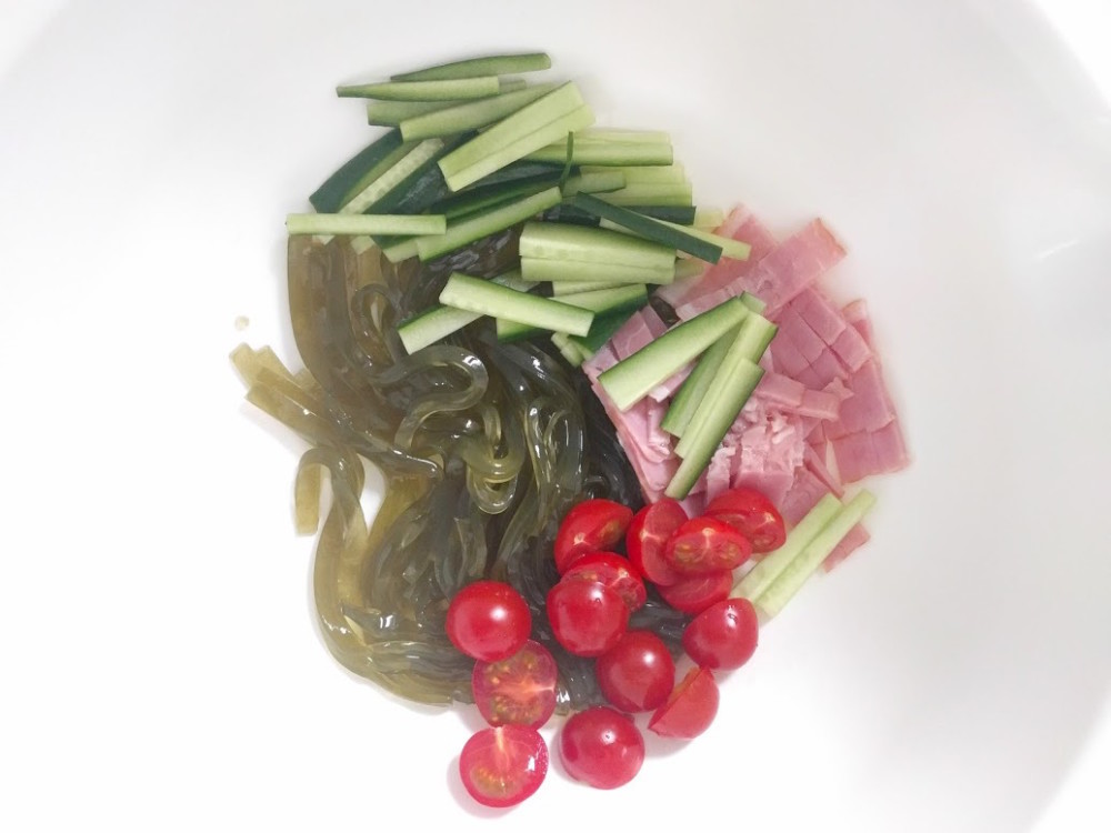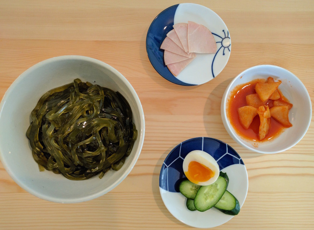 ①具(きゅうり、キムチ、ハム、ゆで卵など)を用意します。