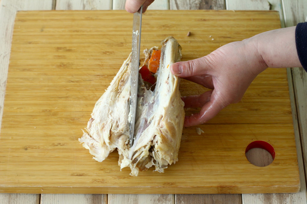 4.胸の中心に包丁を入れて切り開き、胸肉をとりはずす。