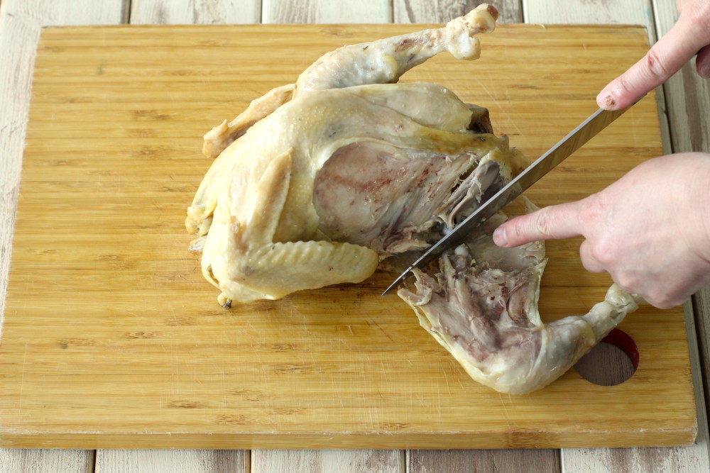 2.モモのつけ根の関節(軟骨)部分に包丁を入れてモモ肉を切りはなす。反対側のモモも同じ要領で切り離す。