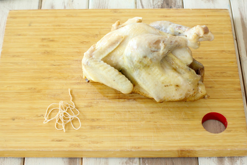 2.丸鶏のお腹の中に1の材料を詰め込み、皮を爪楊枝などで刺して止め、両足をクロスさせてタコ糸などで縛る