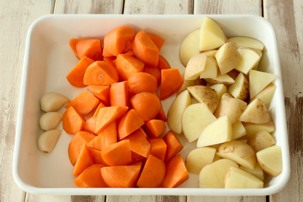 1.にんじんを乱切り、じゃがいもは4等分し、にんにくは皮をむいておく。