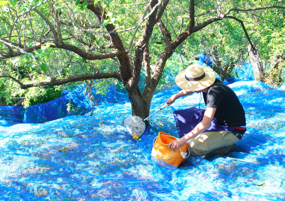 「梅雨」と書くように、5〜6月が収穫期になります。今はちょうど小梅の収穫が終わったところで、青梅の収穫期も間近に控えています。一方で、梅干し用の梅はさらに木の上で完熟させて、ネットを敷いた地面に自然に落ちてきたものを使います。