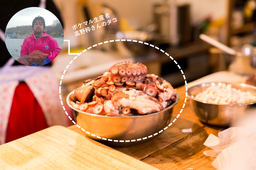 お料理の主役は、ポケマル生産者の小山直樹さんの甘〜いトウモロコシと、高野粋さんの北海道のタコ!