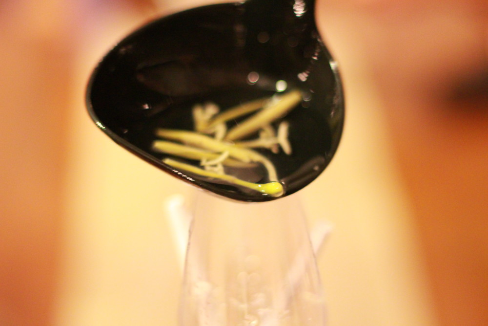 ゼリー状の膜に覆われたじゅんさいは、すくおうとする箸の隙間をチュルリとすり抜け、なかなかとるのが難しいのです。