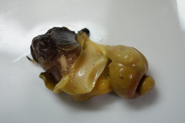高野さんからの注意書きにもありますが、青つぶは別名「ネムリツブ」とも呼ばれ、唾液腺(あぶら)にテトラミンという成分を含んでいます。テトラミンは中毒症状を起こす場合があるので、取り除きます。