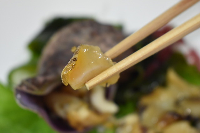 竹串でくるん。いただきまーす!醤油と青つぶの出汁がちょうどよく合って、深みが増しています。刺身のコリコリ感とはまた違った味わい、噛めば噛むほど旨味が倍増!
