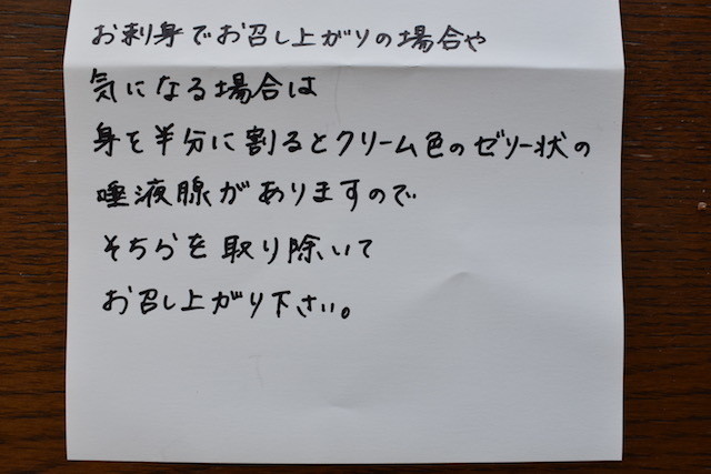 発泡スチロールの蓋を開けると…手書きのお手紙が目に飛び込んできました。やさしい文字にほっこり。高野さんがちゃんと自分の手で獲って詰めてくれたんだなぁと改めて実感。