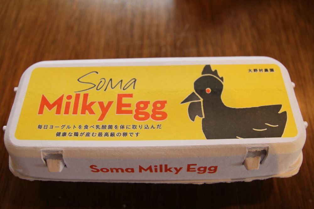 福島県相馬市の菊地将兵さんのこだわり卵です。品種は純国産の「岡崎おうはん」。国産の鶏の品種って少ないんですよ。食用のニワトリの国内生産は国産鶏種は2%程度なそうです。さらに、ミルキーエッグを生んでくれる鶏のエサは全て菊地さん自身の配合です。地元のお米や旬の野菜、お魚屋さんから分けてもらった地元のアラなどを与えています。相馬市で育ち、相馬のものを食べて育った、まさに"相馬100%"の卵です。