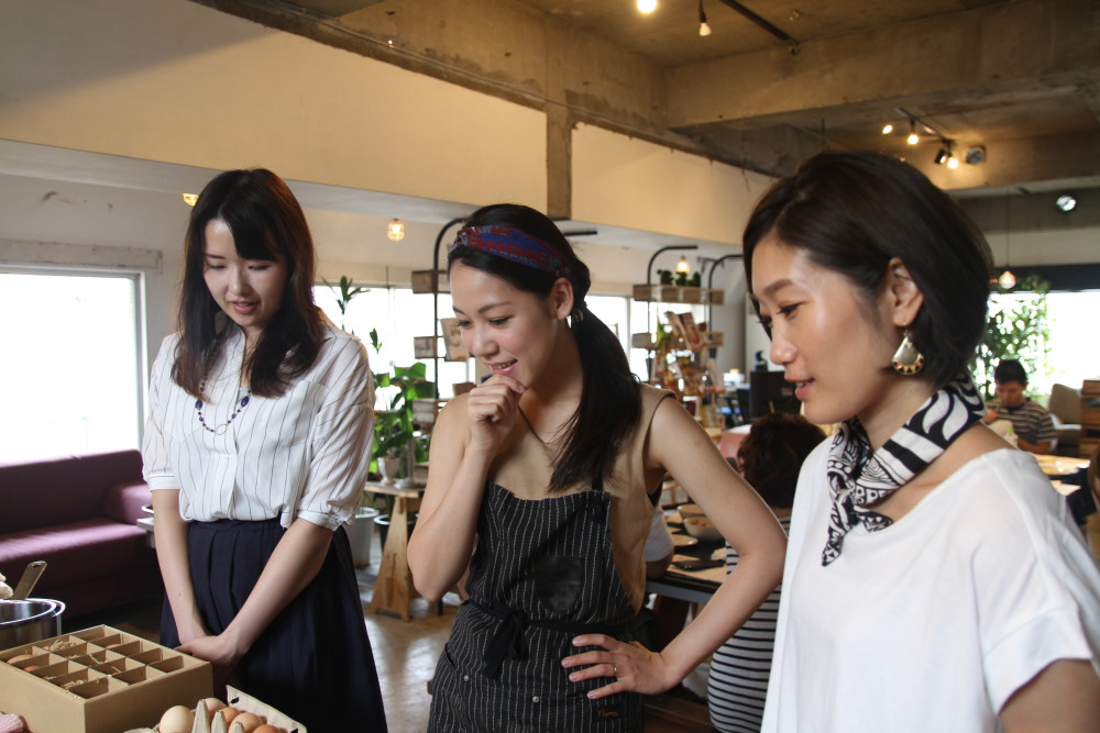 鶏はエサによって卵の色が変わります。今回は3人の生産者さんがそれぞれこだわりのもと、それぞれのエサを与えていたので、このような違いが出たんですね。「へ〜」という感嘆の声とパシャパシャとオムレツの写真をとる音が会場に響きました。