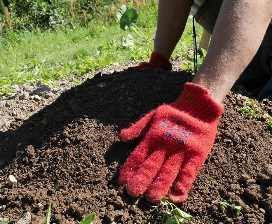 「今年も頼むよ。かぼちゃを大きく育ててくれよ。」と語り掛けながらイノシシの血で染めた軍手で形を整えます。