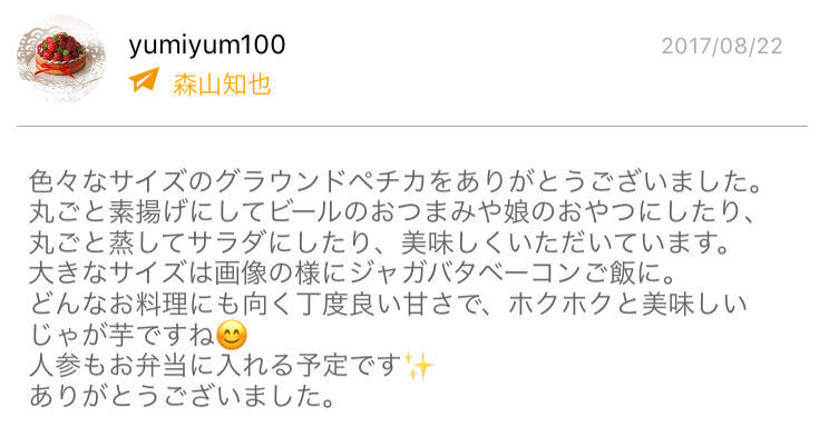 購入した方々がコミュニティに投稿した写真も美味しそうなのばかりで、感動します。あと個人的に、写真の下の方に写っている赤いまだらのじゃがいも「グラウンドペチカ」が気になっています。