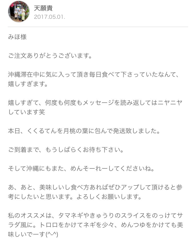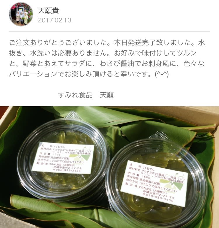 そんなおかわかめがたっぷり入ったところてんが、この「くくるてん」。月桃の葉にくるまれて送られます。アレンジ次第でおかずにもデザートにもなる万能の一品、いかがですか?