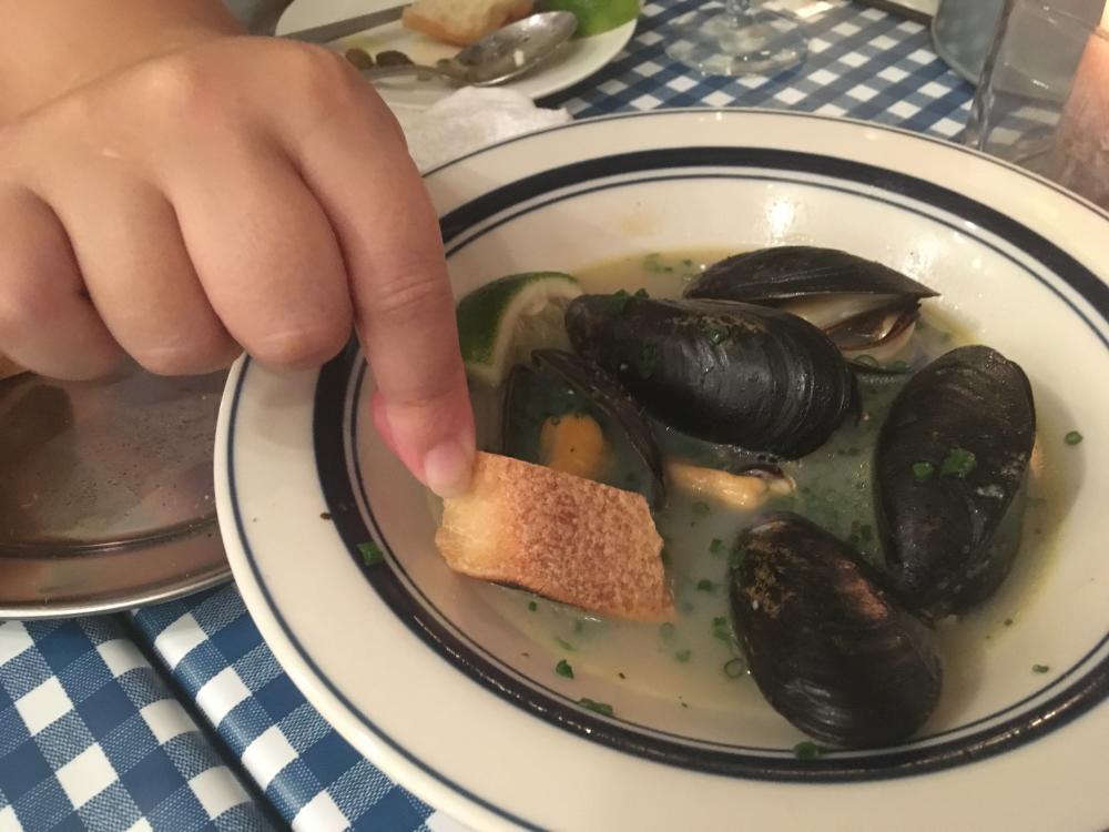 ムール貝の出汁の旨みたっぷりのスープにガーリックトーストを浸すと最高!