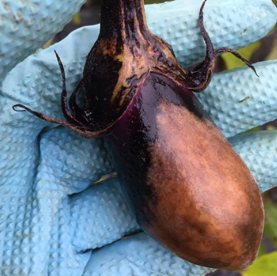 台風被害で傷がついてしまったナス。皮を剥けば、中身は真っ白で美味しいのに・・・