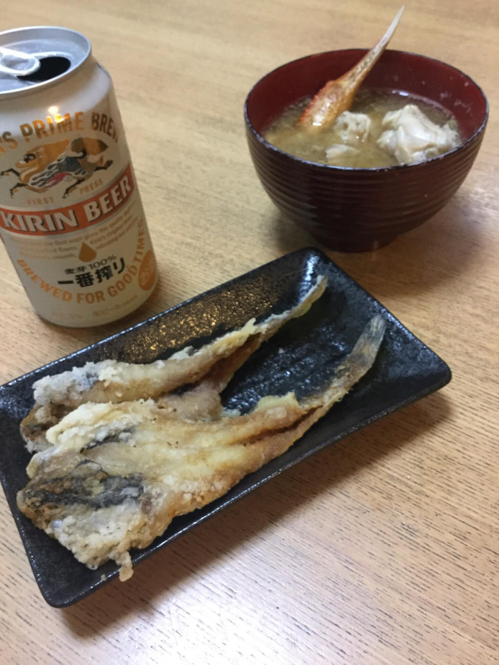 今日はハタハタの唐揚げとカニ味噌汁を堪能してます!