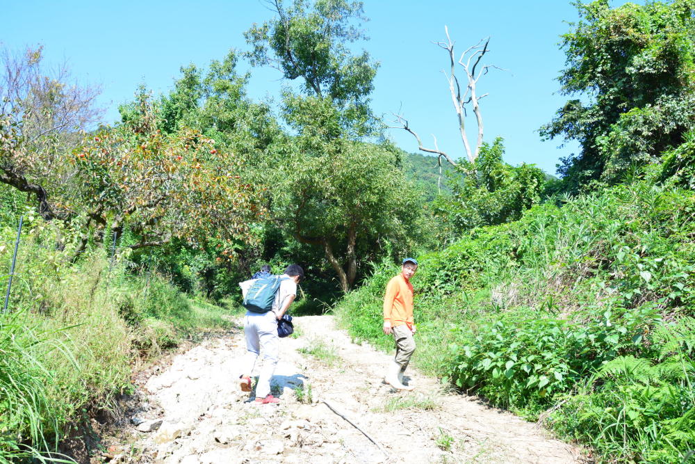 整備した道を秋吉さんと歩きながら登っていった。歩数を数えると、299歩だった。傾斜が厳しいので歩幅は小さいが、それなりの長さである。柿畑に堆積した30㎝あまりの土砂を運んで道路をつくったという。大変な作業だったことが伺えた。