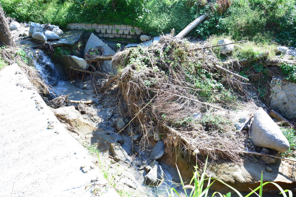 写真右上から左上にかけては、かつては車が入れる幅の道があったが、土石流で破壊された
