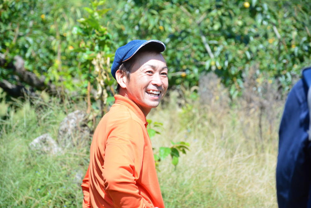 柿畑への道すがら、笑顔を絶やさない秋吉さん。明るい人柄は地域の人からも慕われている