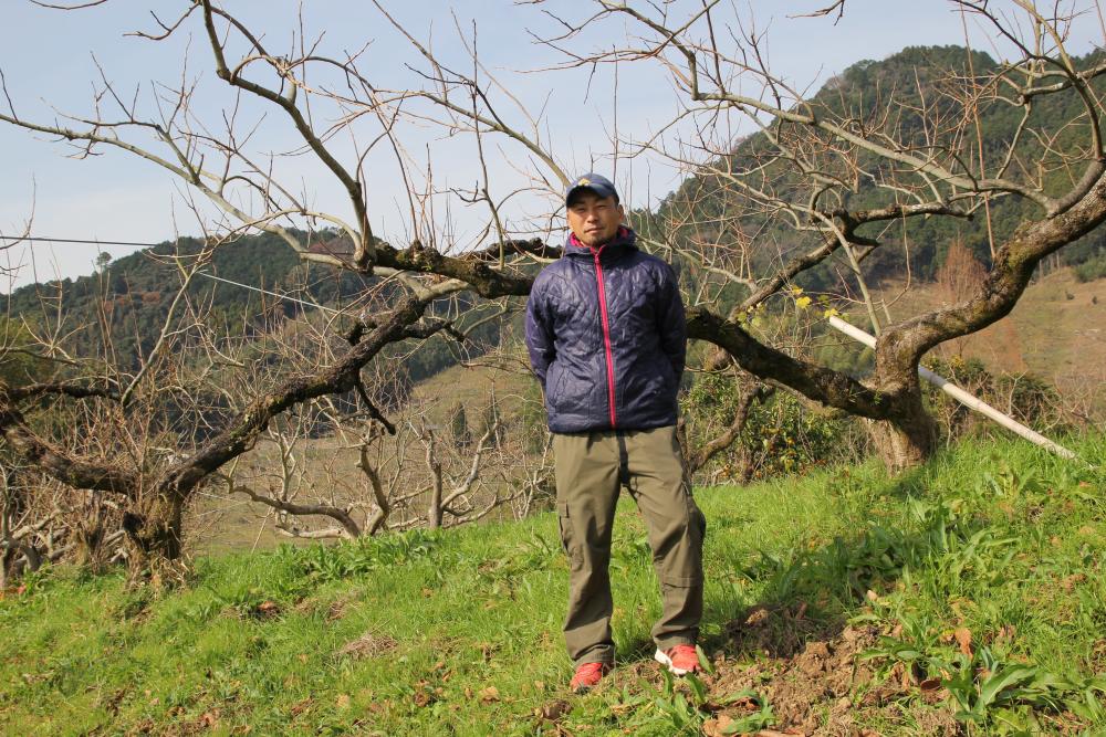2016年12月の柿畑。秋吉さんの足元の土は茶色くふかふかだ