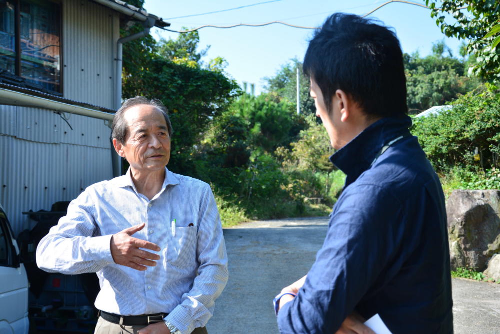 2017年10月10日、およそ3ヶ月ぶりに秋吉智博さんのご自宅を訪問した。敷地内にある作業小屋では、秋吉さんの妻と母が収穫したブドウの出荷作業に追われていた。そこで、秋吉さんと、朝倉市杷木志波地域コミュニティ協議会会長の小江高秋さんから話を伺った。