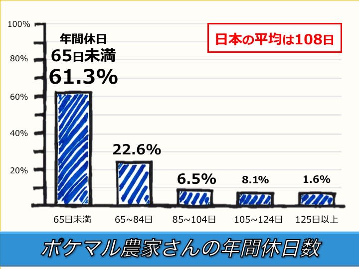 なんと、90%以上の農家さんが日本の平均以下。しかも、65日未満と答えた方が61.3%もいらっしゃいます。1ヶ月あたりお休みできるのは5〜6日ということですね……。