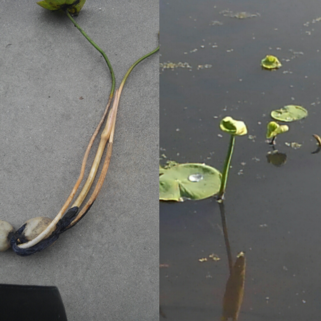 種レンコンも芽が伸びて来ました。この真ん中の芽が右の画像で立ち上がってる葉になります。これからどんどん成長しますよォ