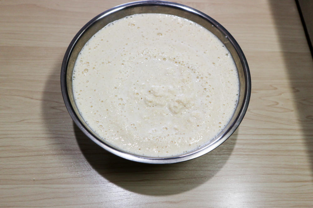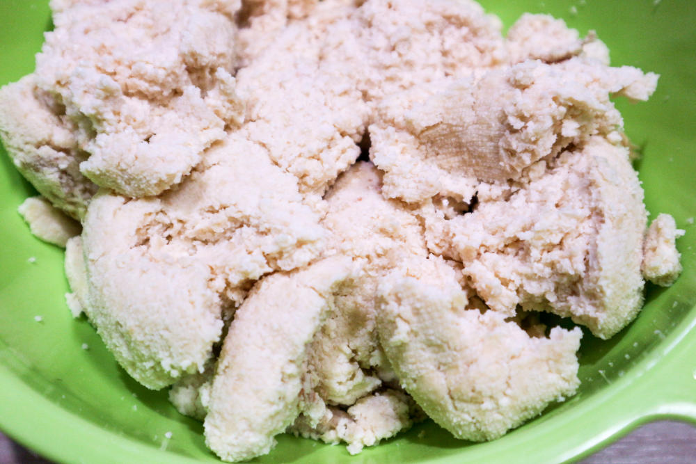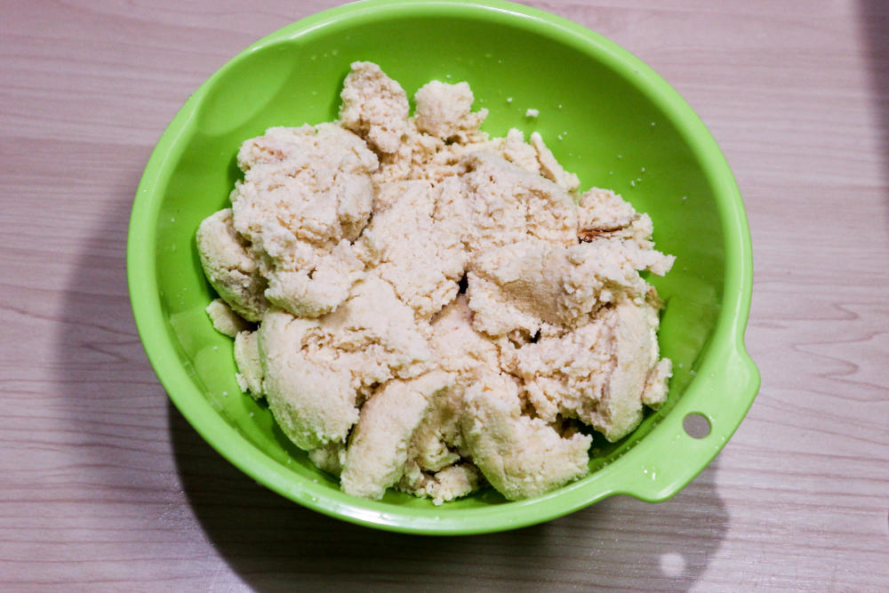 大豆を絞ったあとに残る固形物は「おから」です。おからは、別の容器に移します。